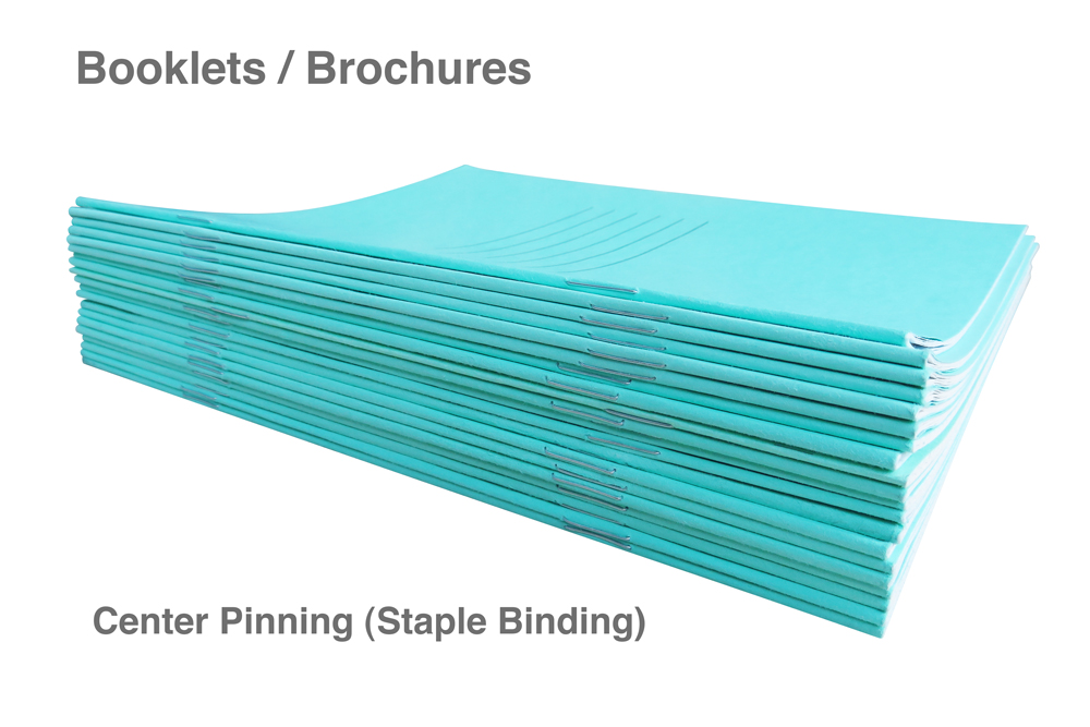 All booklets are saddle stitched, which means neatly and securely stapled at the spine.
